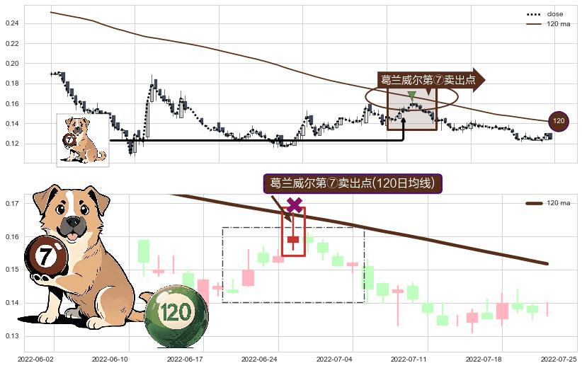 形态多维评估: ⚀ 2022-06-27-日显现 葛兰威尔均线 120日均线 第⑦卖出点 下降趋势的中继信号,后市看跌,卖出信号