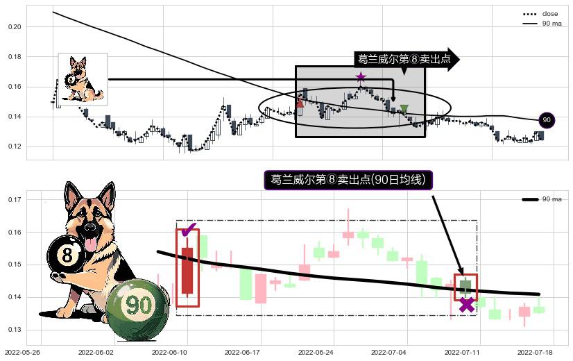 形态多维评估: ⚀ 2022-07-08-日显现 葛兰威尔均线 90日均线 第⑧卖出点 下降趋势的中继信号,后市看跌,卖出信号