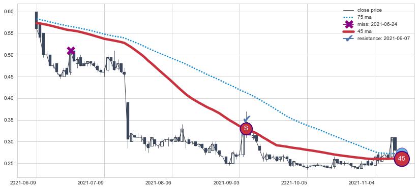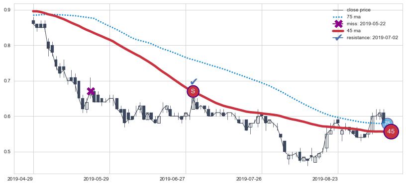 下跌趋势2022-01-07-2022-03-21,均线75, 45确认关键阻力1处