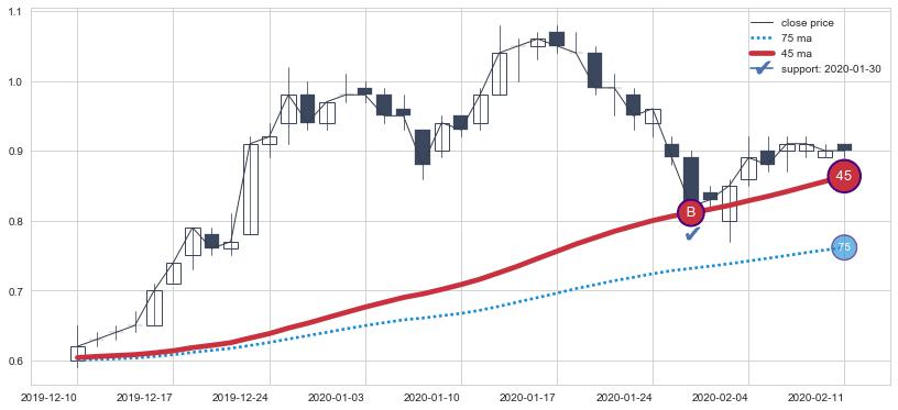 上涨趋势2020-11-09-2021-02-24,均线75, 45确认关键支撑2处