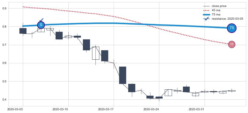 下跌趋势2020-03-03-2020-04-03,均线75确认关键阻力1处
