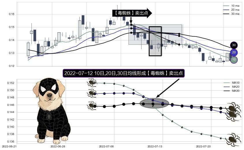 形态多维评估: ⚀ 2022-07-12日显现 10日-20日-30日均线 【毒蜘蛛】卖出点 看空信号,后市看跌,卖出