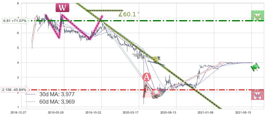 ♘ 支撑价格位2.156,可信任强度59.79%,距离最后交易2021-06-23形成的收盘价格3.980相差 -45.84%