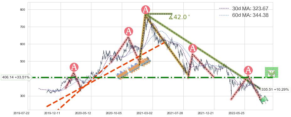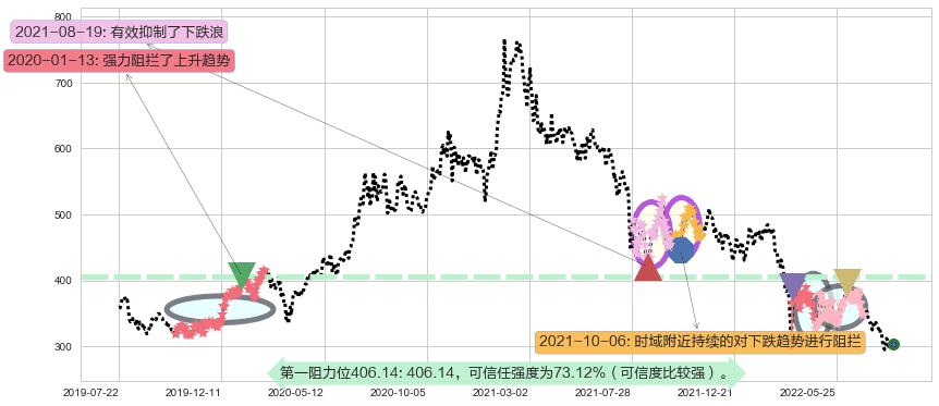 ♘ 阻力价格位406.14,可信任强度73.12%,距离最后交易2022-08-12形成的收盘价格304.20相差 +33.51%