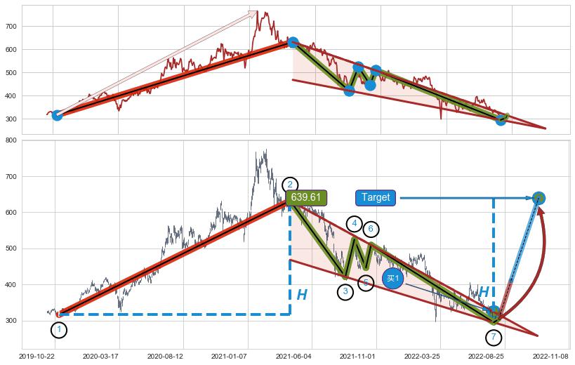 ➢ 最小中继整理涨幅→𝐇: 315.80 (𝐇楔型旗杆的长度:楔型起点→顶点)