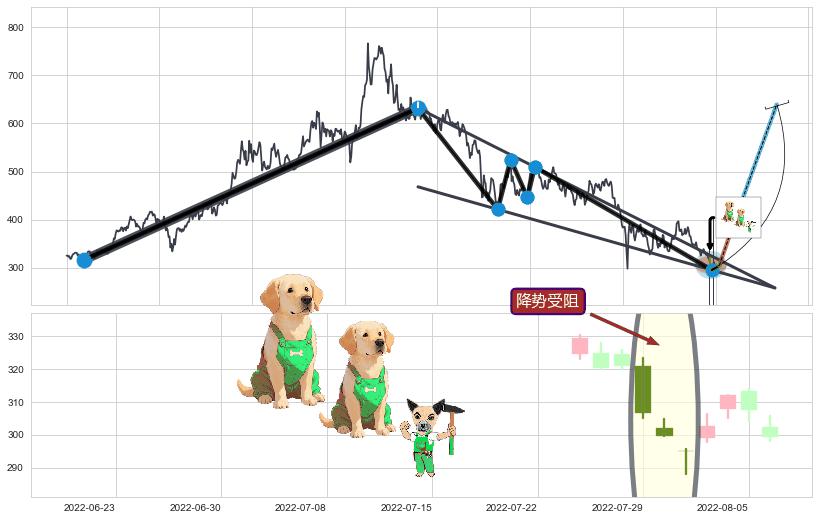 ➢ 5.1: 预测当前第5浪位置(2022-08-02, 295.00),仍然有下跌空间