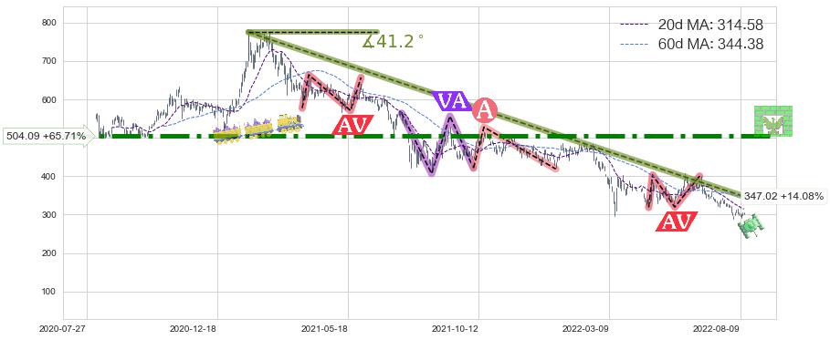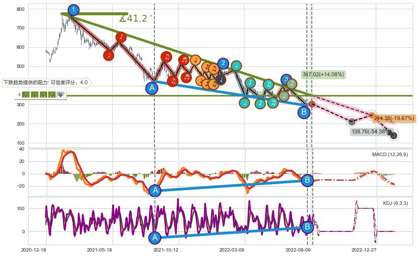 ♘ 在最后的下跌阶段2021-01-25至2022-08-12,存在 持续未破位的阻力位 ,阻力价格347.02,可信任强度82.53%,其距离最后价格304.20相差 +14.08%