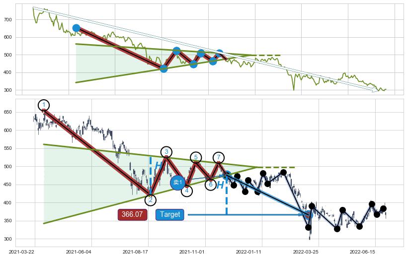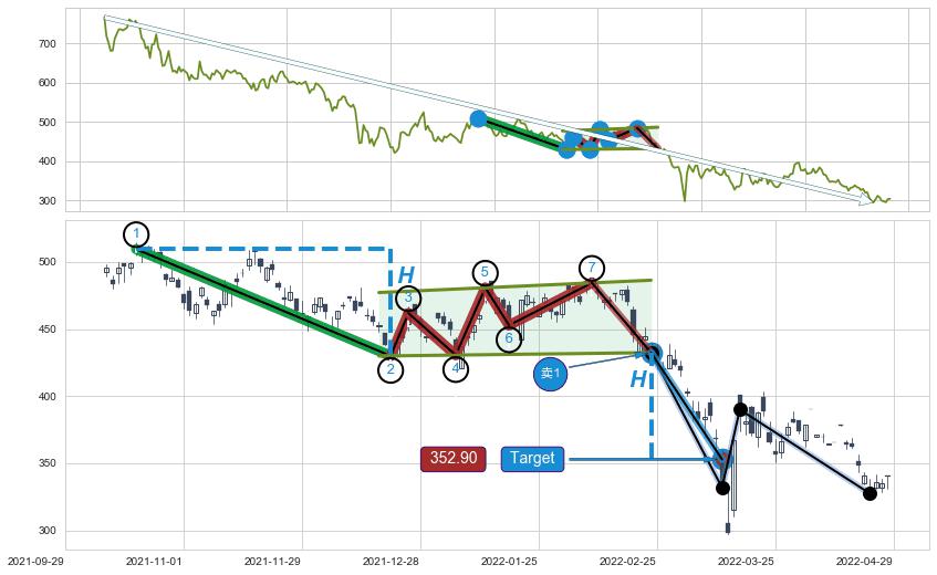 ➢ 【已达成】最小【整理】第一目标价格→(2022-03-14: 352.90 ), 后续继续【整理】下跌动力微弱,下跌较小
