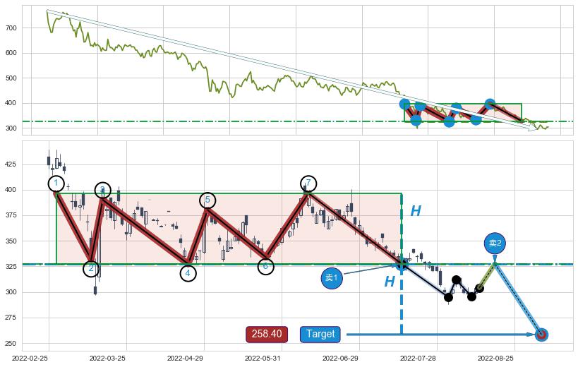 ➣ 最小中继整理跌幅→𝐇: 69.00 (上平行阻力线与下平行支撑线的垂直距离)