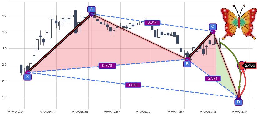 ➣ 未完成【蝴蝶】形态起点X: 2021-12-22, 已到达C点: 2022-03-18, 预测最终D点: 2022-04-08, 共66交易日