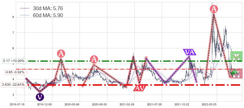 ♘ 阻力价格位5.17,可信任强度83.54%,距离最后交易2022-08-12形成的收盘价格4.69相差 +10.20%