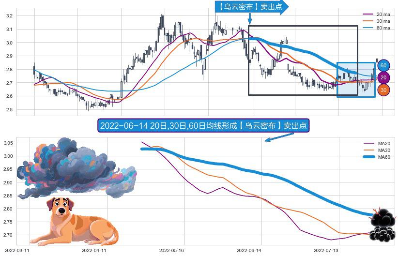 ⚀ 2022-04-27日-2022-07-27日显现 20日-30日-60日均线 【乌云密布】卖出点 看空信号,后市看跌,卖出