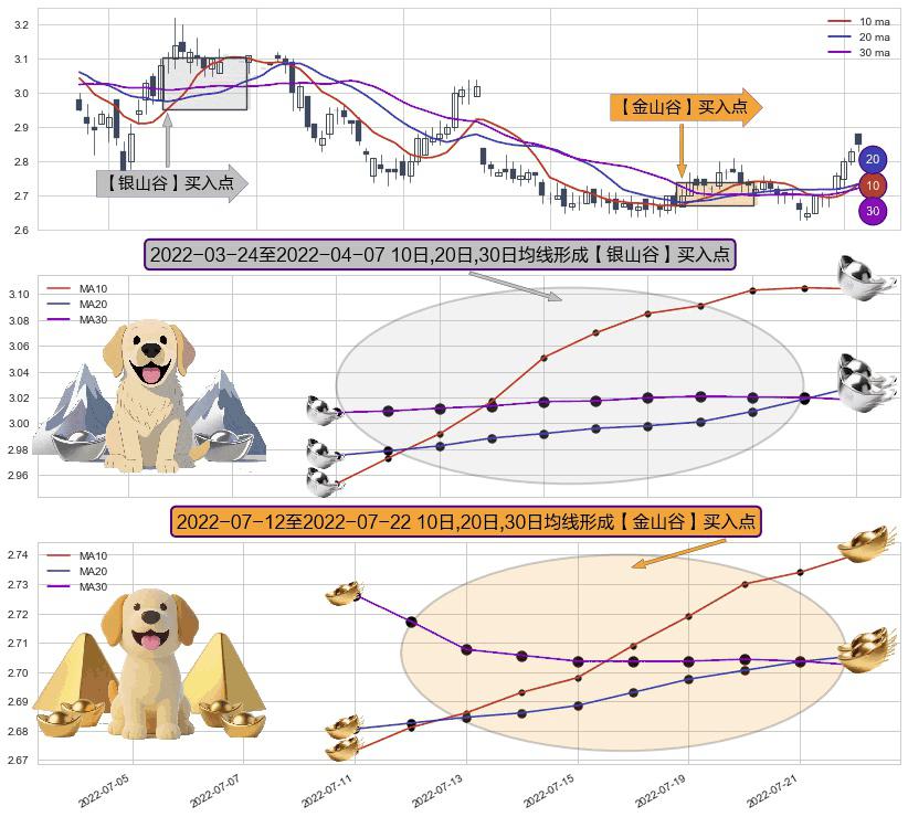 ⚃ 2022-07-13-日至2022-07-22-日显现 10日-20日-30日均线 【金山谷】买入点 其再次确认了买入信号,可靠性更强,买入