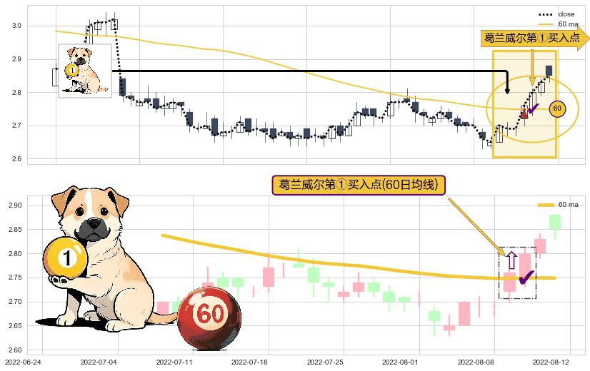 ⚀ 2022-08-09-日显现 葛兰威尔均线 60日均线 第买①入点 走势反转见底信号,后市看涨,买进信号