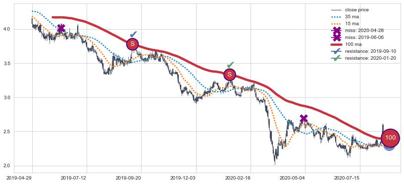 ➢ 最优均线组合共正确确认支撑阻力信号4处,正确确认率 57.14%
