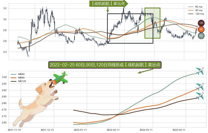 ⚀ 2021-12-30日-2022-04-25日显现 60日-90日-120日均线 【战机起航】卖出点 看空信号,后市看跌,卖出
