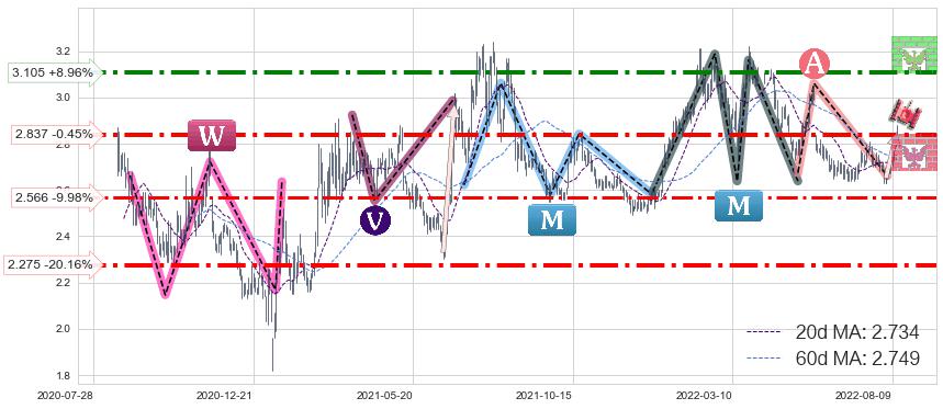 ♘ 阻力价格位3.105,可信任强度71.44%,距离最后交易2022-08-12形成的收盘价格2.850相差 +8.96%