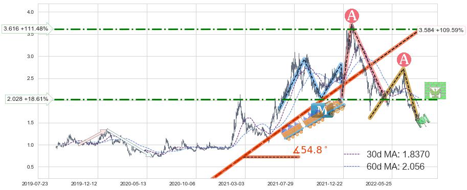 ♘ 阻力价格位2.028,可信任强度61.32%,距离最后交易2022-08-12形成的收盘价格1.7100相差 +18.61%