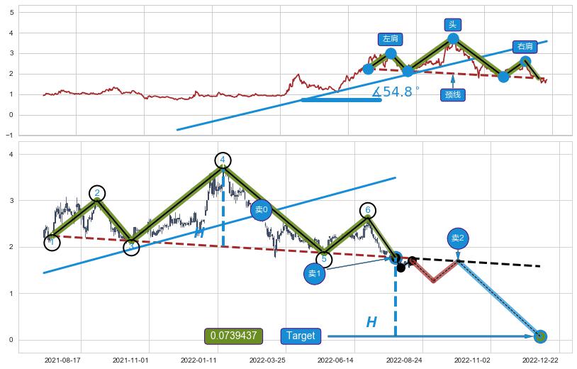 | 3 🅚:【毒蜘蛛】卖出点 ➕ 📐:头肩顶下行突破支撑位破位, 猜想持续下沉下跌,被突破的支撑位已变为阻力位 ☞ 看空信号 ⇥ 【均线】交织【图形】⇥ 综合量化分数: 4 | > |