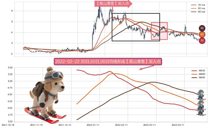 ⚀ 2021-12-17日-2022-04-28日显现 30日-60日-90日均线 【高山滑雪】买入点 看多信号,后市看涨,买入