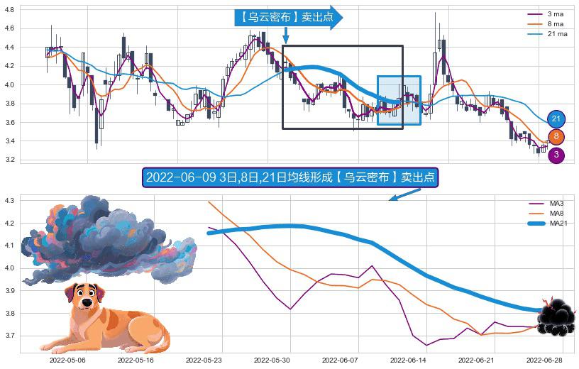 ⚀ 2022-05-20日-2022-06-27日显现 3日-8日-21日均线 【乌云密布】卖出点 看空信号,后市看跌,卖出