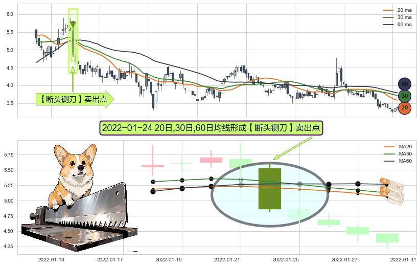 ⚀ 2022-01-24日显现 20日-30日-60日均线 【断头铡刀】卖出点 看空信号,后市看跌,卖出