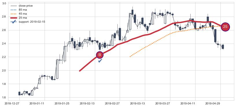 ⚅ 卖点向下突破均线后,价格走势有持续向下的迹象,但动能稍显不足,迟迟不能远离均线