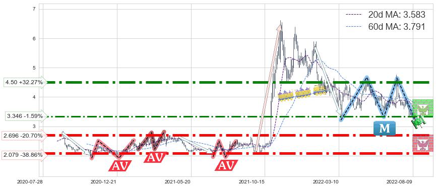 ♘ 阻力价格位3.346,可信任强度63.64%,距离最后交易2022-08-12形成的收盘价格3.400相差 -1.59%