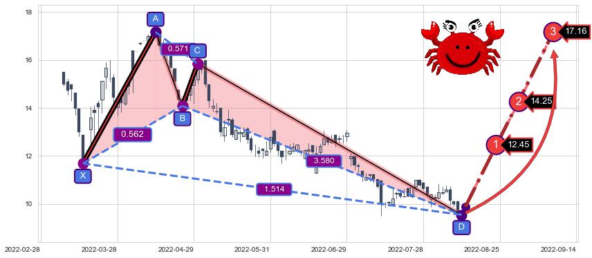 ➣ 已完成【螃蟹】形态起点X: 2022-03-15, 终点D: 2022-08-11, 共100交易日