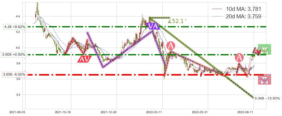 ♘ 阻力价格位3.909,可信任强度78.33%,距离最后交易2022-08-12形成的收盘价格3.890相差 +0.50%
