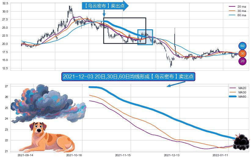 ⚀ 2021-10-21日-2022-01-17日显现 20日-30日-60日均线 【乌云密布】卖出点 看空信号,后市看跌,卖出