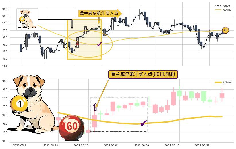 ⚀ 2022-05-26-日显现 葛兰威尔均线 60日均线 第买①入点 走势反转见底信号,后市看涨,买进信号