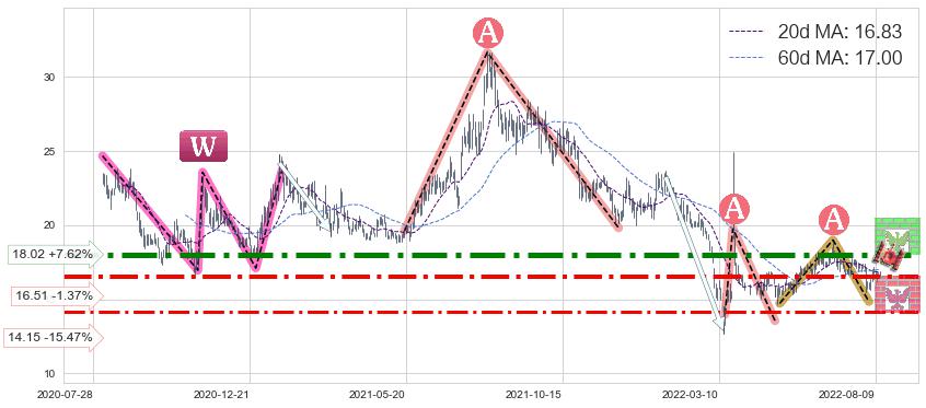 ♘ 阻力价格位18.02,可信任强度90.19%,距离最后交易2022-08-12形成的收盘价格16.74相差 +7.62%