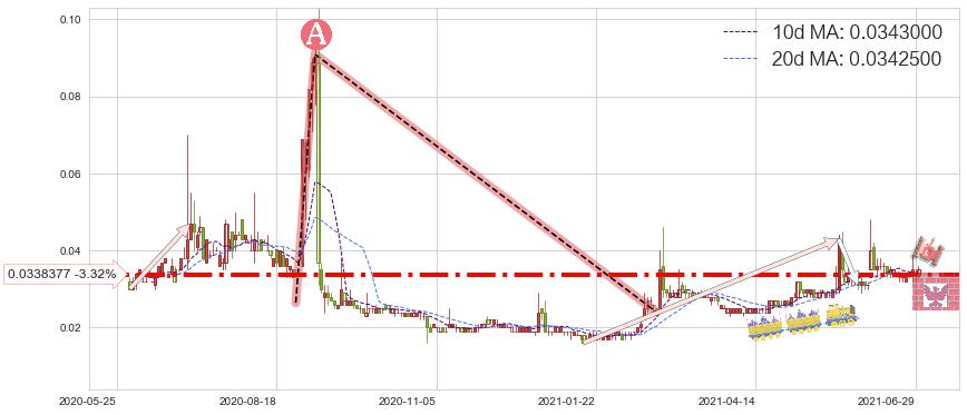 2021-06-22: 第一支撑位0.0338377有效抑制了下跌浪,成功阻止了价格的继续下跌。