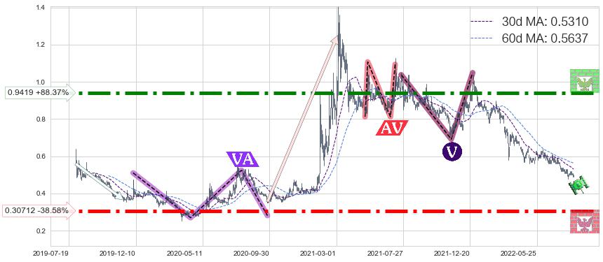 ♘ 支撑价格位0.30712,可信任强度88.47%,距离最后交易2022-08-12形成的收盘价格0.5000相差 -38.58%