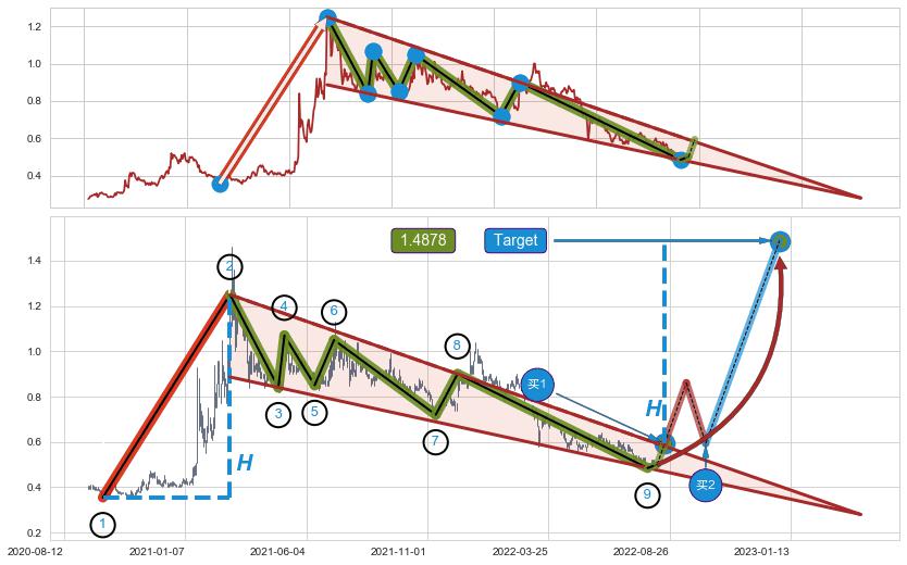 ➢ 最小中继整理涨幅→𝐇: 0.8950 (𝐇楔型旗杆的长度:楔型起点→顶点)