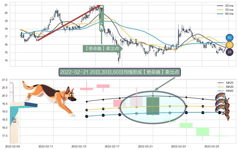 形态多维评估: ⚀ 2022-02-21日显现 20日-30日-60日均线 【绝命跳】卖出点 看空信号,后市看跌,卖出