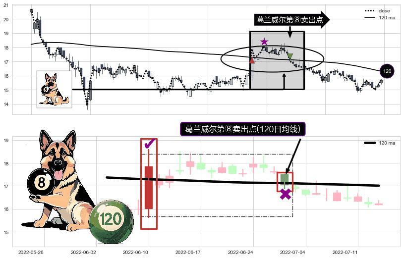 形态多维评估: ⚀ 2022-06-29-日显现 葛兰威尔均线 120日均线 第⑧卖出点 下降趋势的中继信号,后市看跌,卖出信号