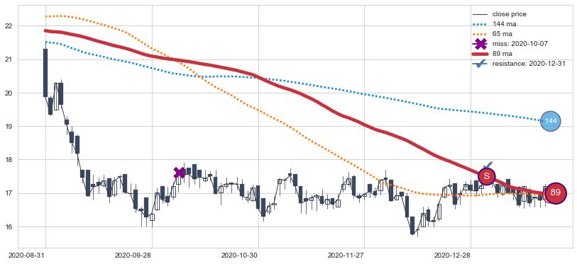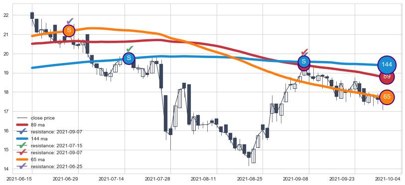 下跌趋势2021-06-15-2021-10-04,均线144, 89, 65确认关键阻力3处