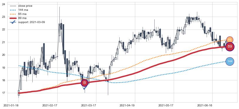 上涨趋势2021-01-18-2021-06-25,均线89确认关键支撑1处