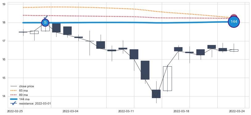 下跌趋势2022-02-25-2022-03-24,均线144确认关键阻力1处