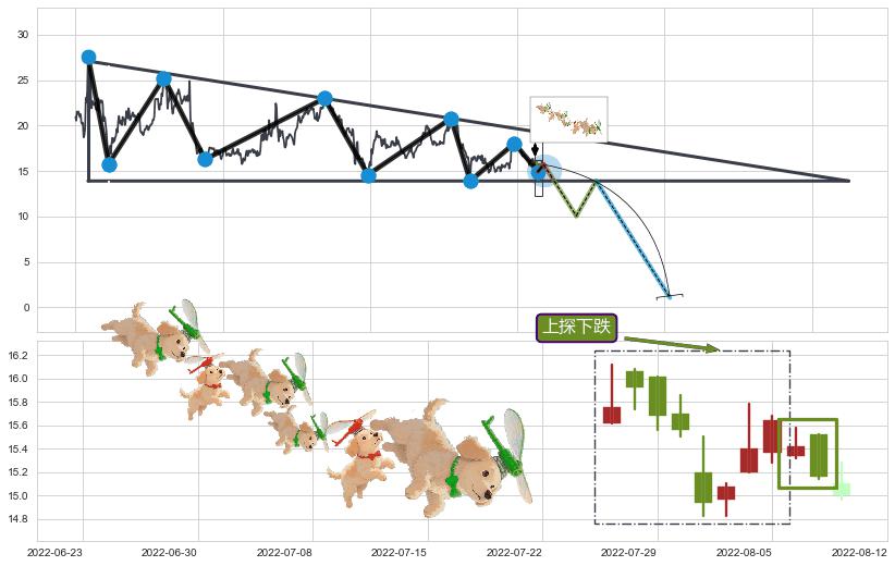 | 3 🅚:下跌抵抗 ➕ 📐:下降三角整理猜想突破点临近,临近关键支撑位,预期下沉突破下跌 ☞ 看空信号 ⇥ 【🅚线】交织【图形】⇥ 综合量化分数: 40 | > |