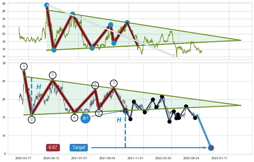 ➣ 【未确认突破,预测即将形成突破】下降三角形整理起点:2020-02-07, 预测突破点:2022-09-01,形态共634交易日