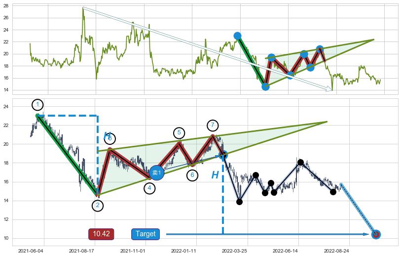➢ 最小中继整理跌幅→𝐇: 8.42 (𝐇楔型旗杆的长度:楔型起点→顶点)