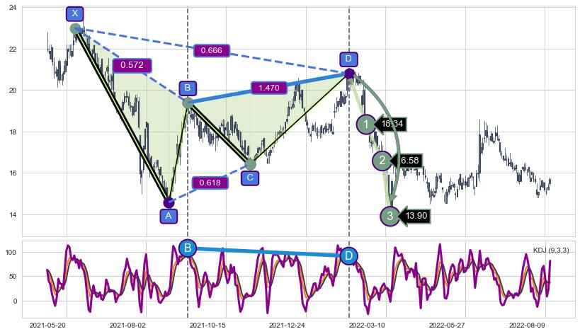 ➢ 谐波价格D点比B点高 ⤴,【KDJ】指标D点比B点低 ⤵️