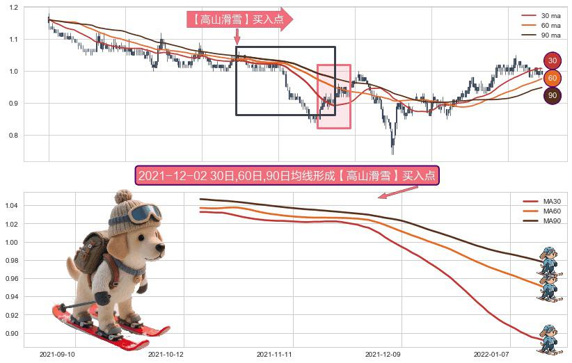 ⚀ 2021-10-19日-2022-01-17日显现 30日-60日-90日均线 【高山滑雪】买入点 看多信号,后市看涨,买入