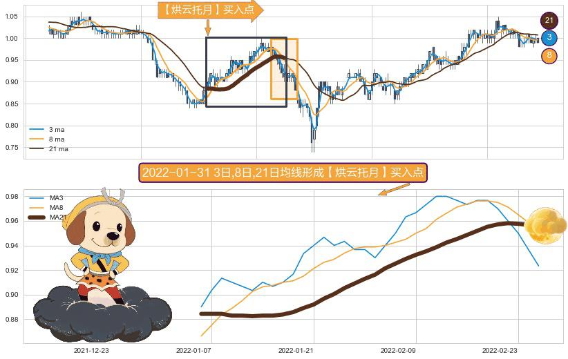 ⚀ 2022-01-06日-2022-02-25日显现 3日-8日-21日均线 【烘云托月】买入点 看多信号,后市看涨,买入