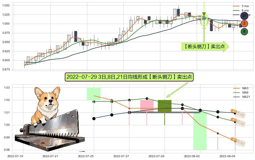 ⚀ 2022-07-29日显现 3日-8日-21日均线 【断头铡刀】卖出点 看空信号,后市看跌,卖出