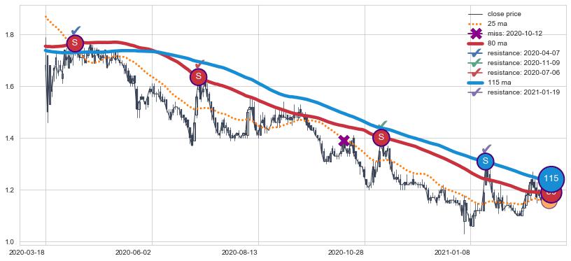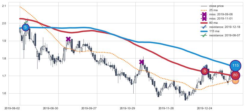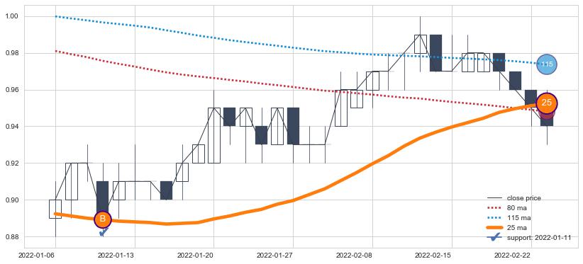 ⚁ MA3和MA8走势平行,且始终保持在短距离内,MA21始终在短中期均线下方,与短中期均线保持一定的距离,微微上行