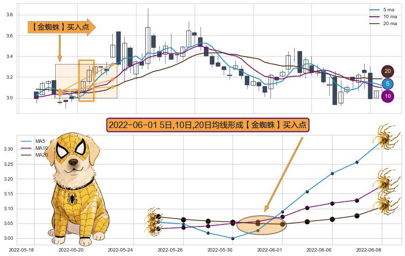 形态多维评估: ⚀ 2022-06-01日显现 5日-10日-20日均线 【金蜘蛛】买入点 看多信号,后市看涨,买入